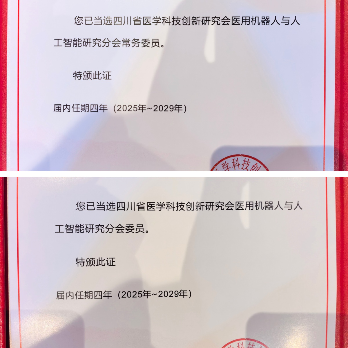 在大会首日举行的四川省医创会医用机器人与人工智能研究分会成立仪式上,四川泌尿外科医院曾政光教授当选为分会常务委员;王培禄主任当选为分会委员。这标志着川泌专家不仅深度参与省级智能医疗创新协作体系的共建,更将以此为支点,在推动相关技术规范化与高质量发展中发挥关键引领作用。