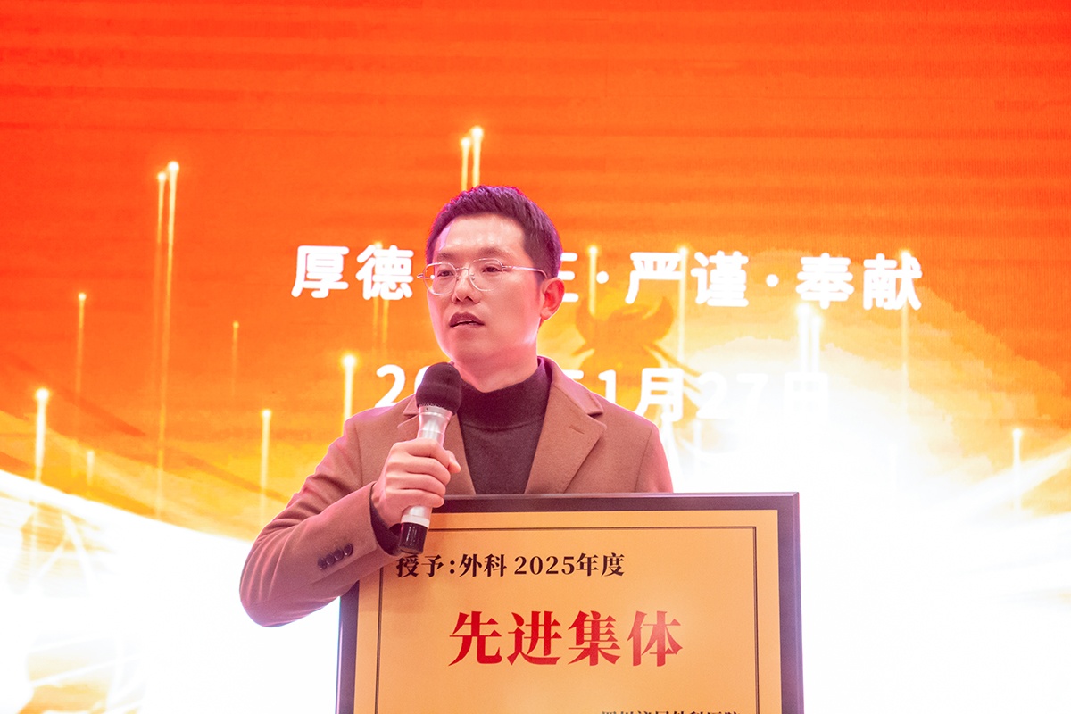 外一科主任王培禄作为代表发言,他首先感谢院领导与兄弟科室的支持,并将荣誉归功于外科团队的辛勤付出。他表示,“先进集体”是一份沉甸甸的荣誉,更是一面时刻审视自我的镜子,鞭策团队以更用心、更规范的标准投入工作。面对过去一年的不足,他承诺将带领团队在新的一年里弥补短板、追求卓越,并充满信心地表示要在2026年继续将先进集体的奖牌抱回家。