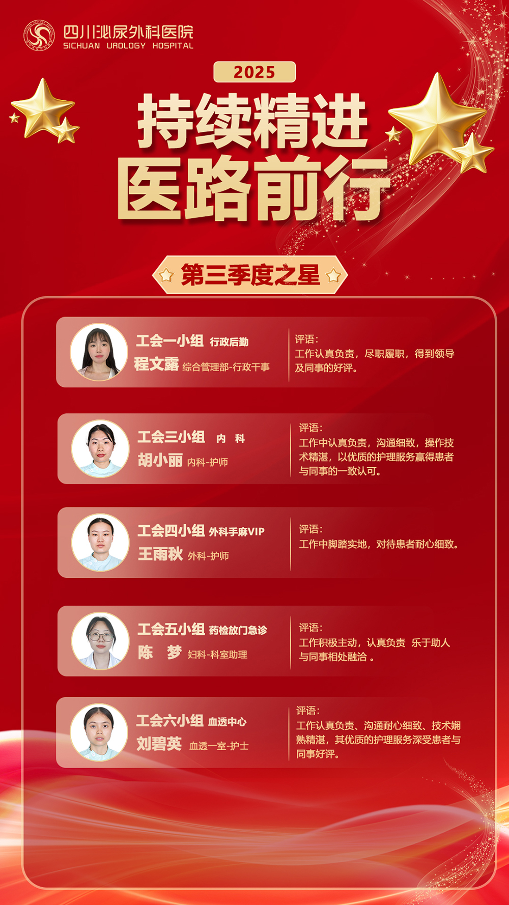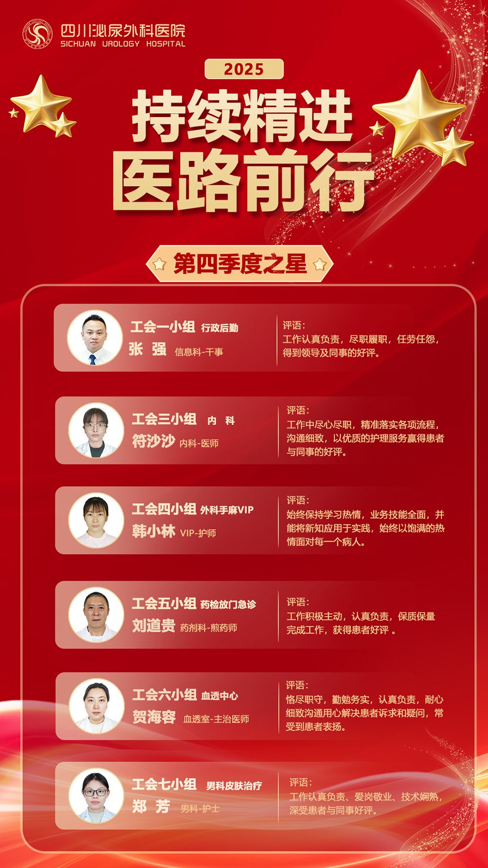 为表彰先进、倾听一线、凝聚共识,3月16日,四川泌尿外科医院工会组织召开了2025年第三、四季度“季度之星”座谈会。会议采用轻松、开放的非正式交流形式,打破层级壁垒,搭建坦诚对话的桥梁,共同探讨川泌发展与服务质量提升之路。