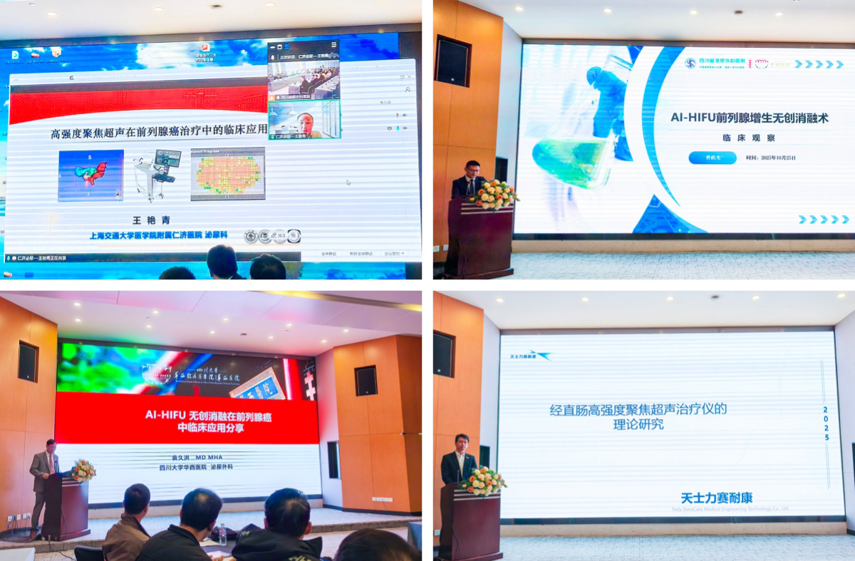 专题讲座环节,多位专家围绕AI-HIFU技术的理论基础、临床实践与多学科协作展开深入探讨。上海交通大学医学院附属仁济医院王艳青教授系统阐述了《高强度聚焦超声在前列腺癌治疗中的临床应用》;四川泌尿外科医院曾政光教授汇报了《AI-HIFU前列腺增生消融术临床观察》的初步成果;四川大学华西医院袁久洪教授结合病例分享了《AI-HIFU无创消融在前列腺癌中的临床应用》。