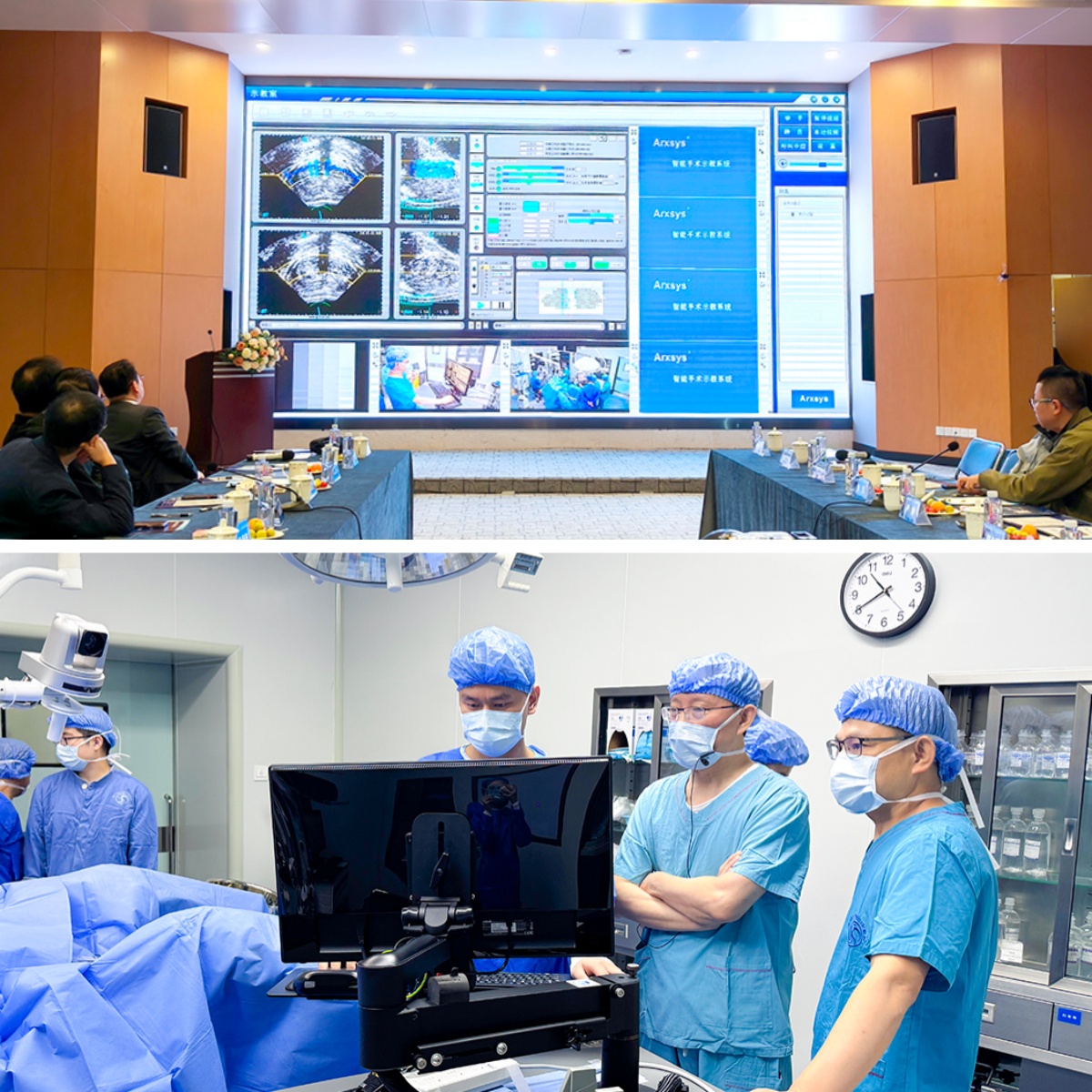 手术示教环节将会议推向高潮。曾政光教授团队在手术室现场实施AI-HIFU前列腺无创消融术,通过大屏同步直播手术全过程,并结合影像导航、靶区规划、能量调控等关键步骤进行细致讲解,同时与会场实时连线,即时解答专家提问,直观展现技术的操作逻辑与临床可行性。