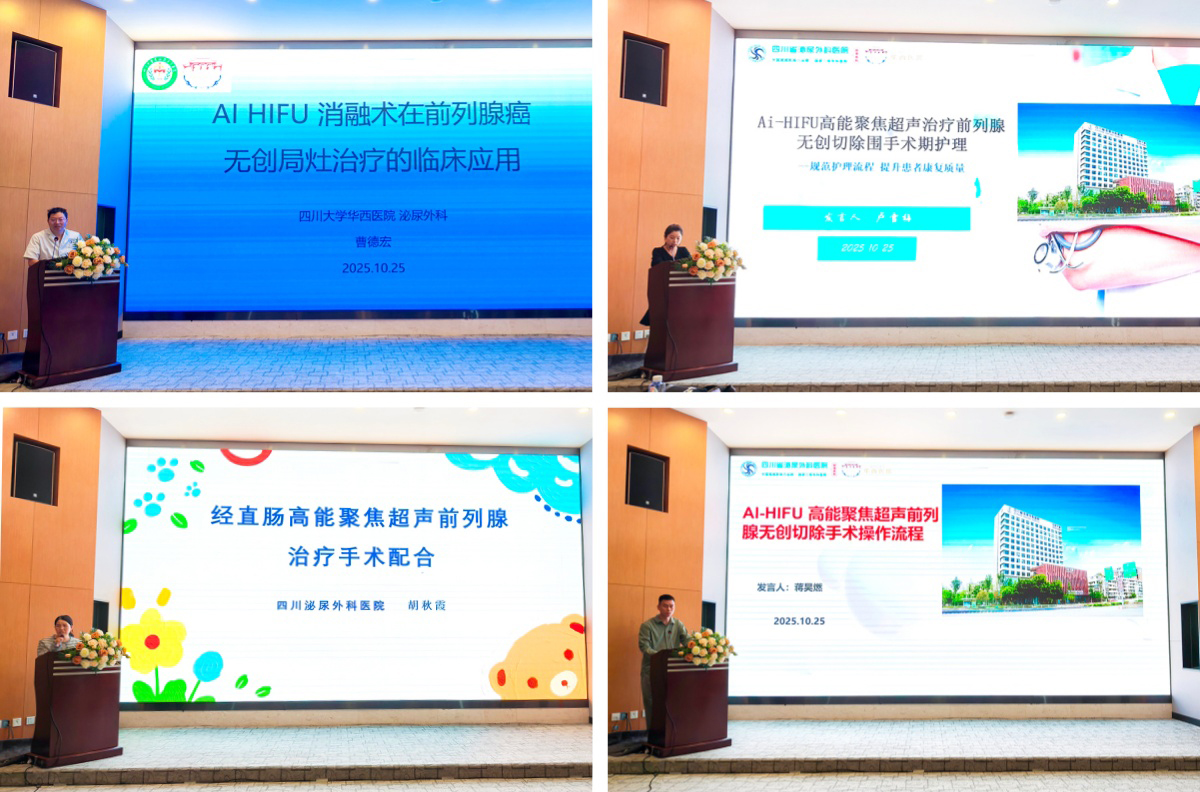 在后续议程中,四川大学华西医院曹德宏教授深入剖析了《AI-HIFU消融术在前列腺癌无创局灶治疗的临床应用》;四川泌尿外科医院医护团队集体亮相,全方位展示技术落地的协同模式: 蒋昊燃医生详解《AI-HIFU高能聚焦超声前列腺无创切除手术操作流程(医生篇)》,胡秋霞主管护师介绍《手术操作流程(护士篇)》,外一科卢雪梅护士长则分享了《围手术期护理》的关键要点。这一系列分享全面呈现了从术前评估、术中配合到术后管理的标准化全流程,充分体现了“医护一体、精准协同”的现代临床实践特色。