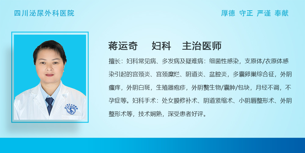 主刀医生蒋运奇是四川泌尿外科医院妇科骨干医师,深耕妇科临床工作多年,擅长各类妇科常见病、多发病及疑难杂症的诊治,尤其在女性盆底功能障碍、生殖道感染、内分泌失调、不孕症等领域经验丰富。在妇科整形与微创手术方面,他技术娴熟,已成功开展大量处女膜修补术、阴道紧缩术、小阴唇整形术、外阴整形术等,深受患者信赖与好评。