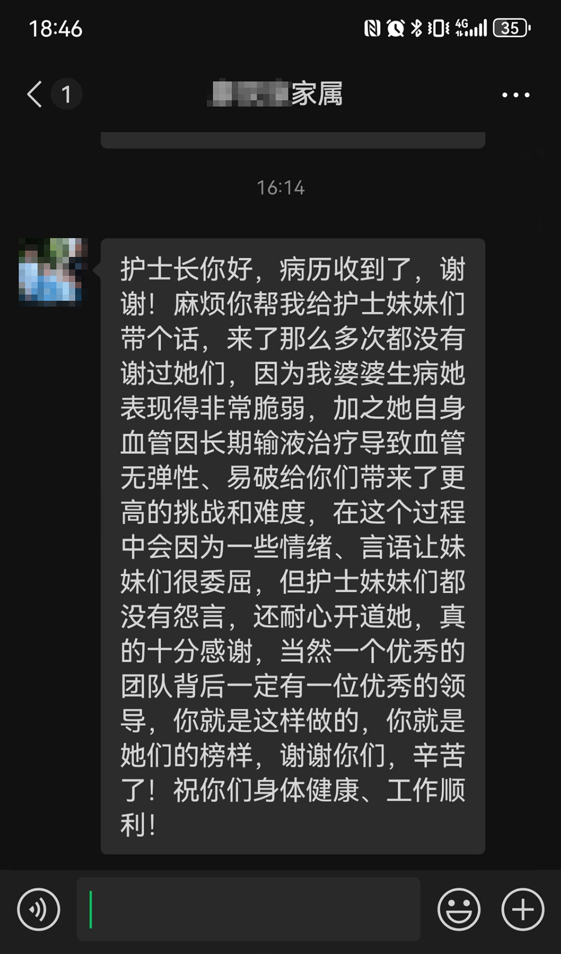“护士长你好,病历收到了,谢谢!麻烦你帮我给护士妹妹们带个话……因为我婆婆生病,她表现得非常脆弱,加上长期输液导致血管无弹性、易破,给你们带来了更高的挑战和难度。过程中可能因情绪或言语让妹妹们委屈了,但她们始终没有怨言,还耐心开导她,真的十分感谢。当然,一个优秀的团队背后一定有一位优秀的领导,你就是这样做的,你就是她们的榜样!”