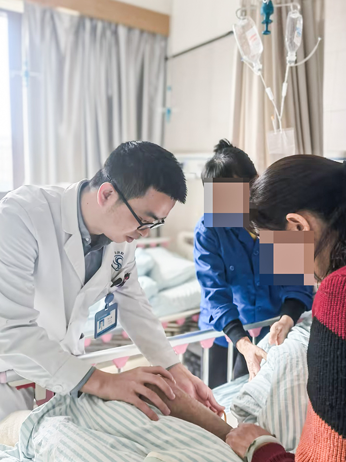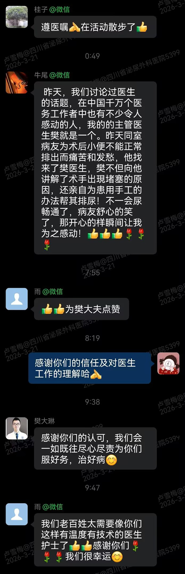 这一幕,恰好被散步归来的老谢看在眼里。他将这份感动默默记下,并分享到了川泌的“医患交流群里”。他写道:“昨天,同屋的病友排尿不顺,樊医生不仅耐心解释,还亲手帮忙。看到尿通了,病友笑了,我在旁边看着,心里满是感动。”